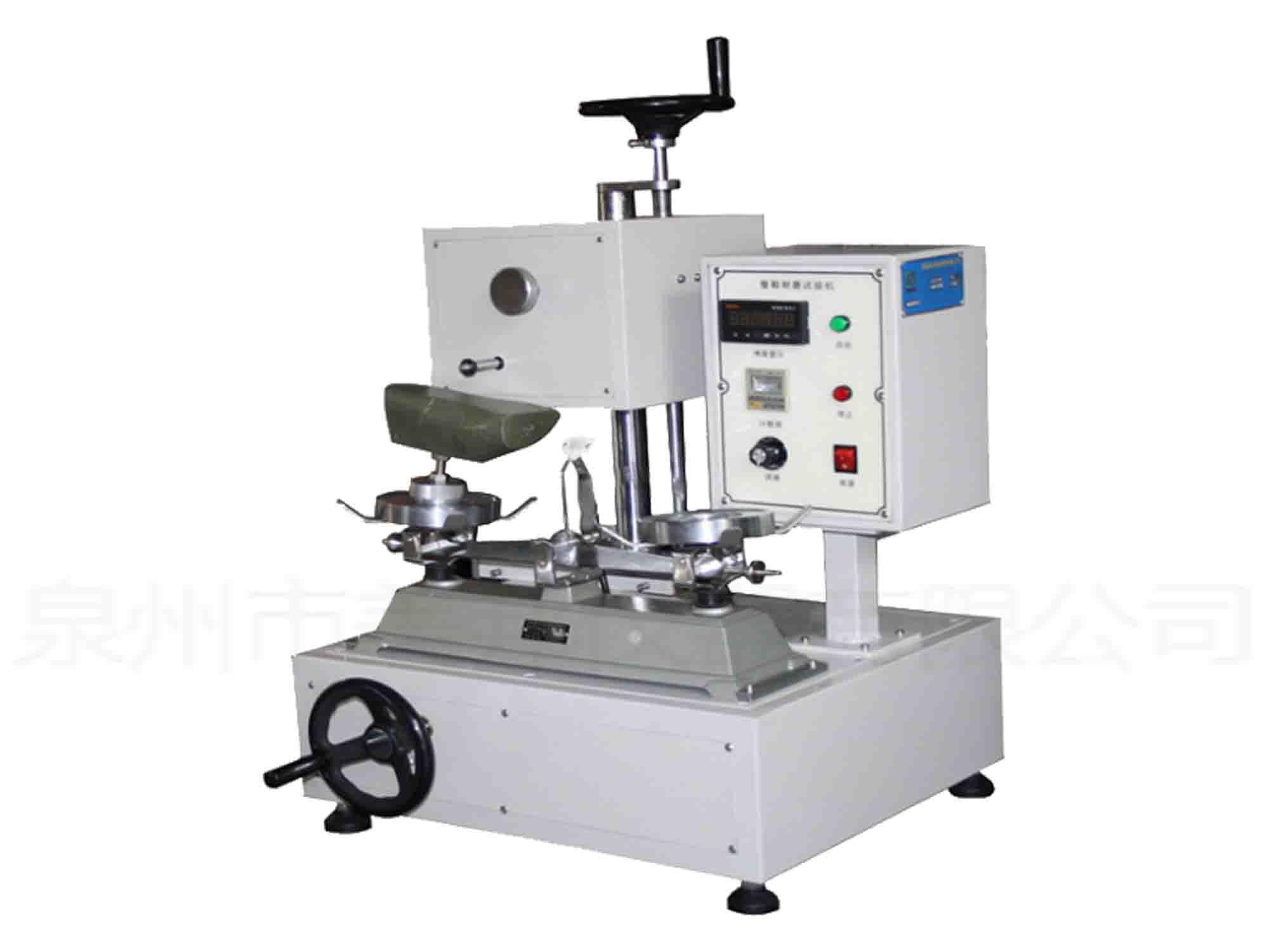 本機系用來測試成鞋鞋底和成型底(片)的耐磨性能。利用旋轉(zhuǎn)的磨輪垂直壓在試件上,并以一定負荷,一定速度及一定時間對試件進行磨耗試驗,藉以量測試件的磨痕長度。