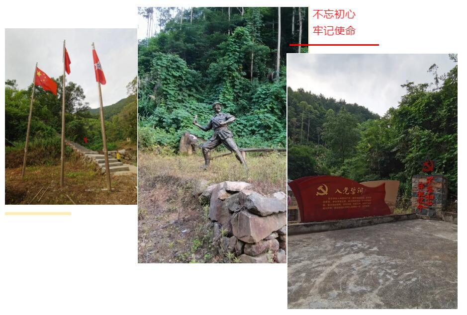 路的兩旁每隔一段路程,豎立著長征重大事件歷史記錄,紅軍革命歷史博物館外圍豎立著三面旗幟,隨風(fēng)飄蕩,讓人肅然起敬,往里走,有座土石疊成的房子,大門上掛著牌匾—【長征故事】,房子旁豎立著“不忘初心、牢記使命”以及“入黨誓詞”,之后我們進(jìn)行全體合照。