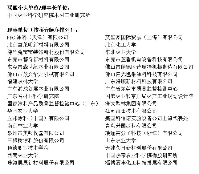 在理事長單位中國林業(yè)科學(xué)研究院木材工業(yè)研究所的牽頭下,木材涂料與涂裝國家創(chuàng)新聯(lián)盟目前由37家單位組成。