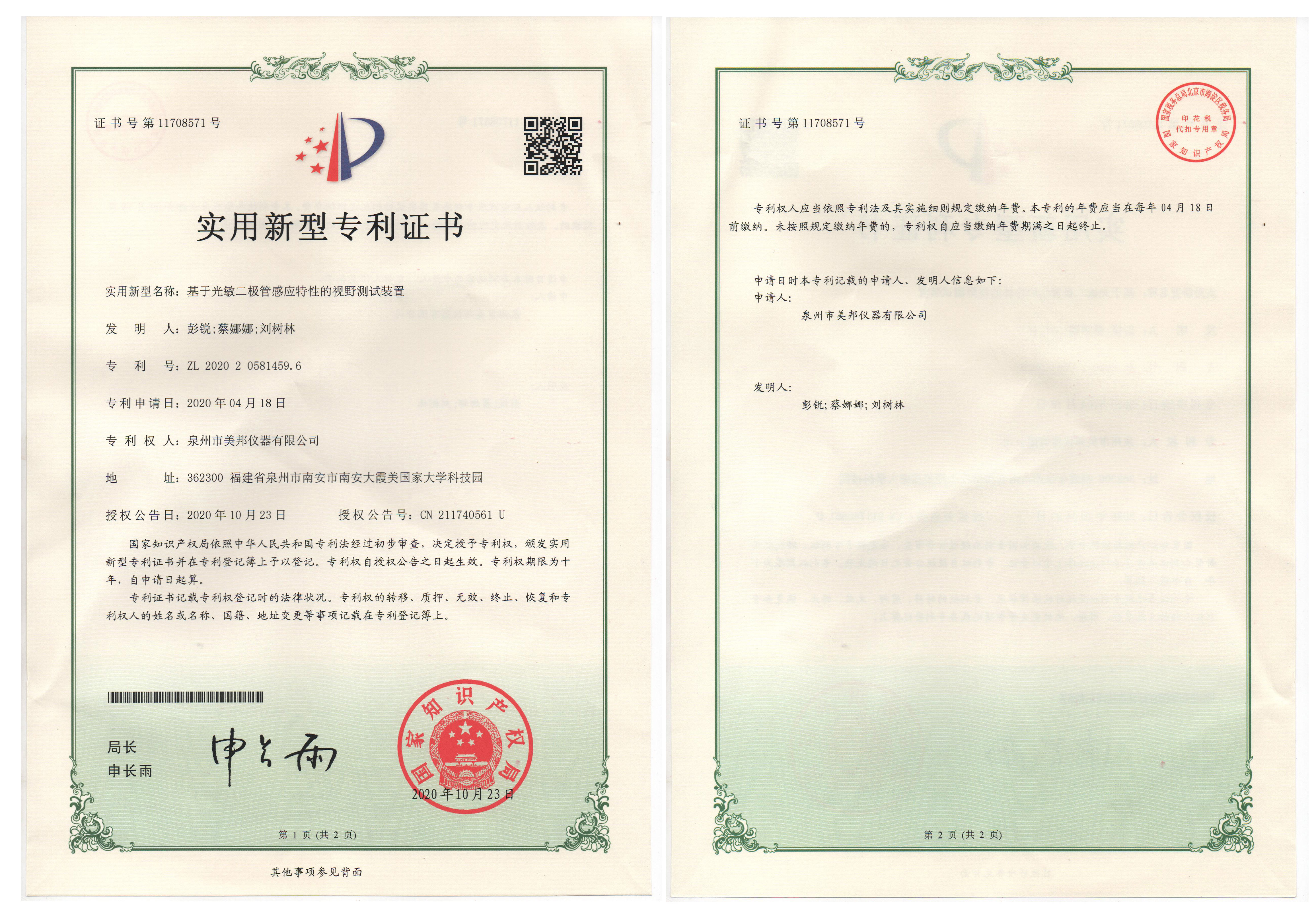 近日,我公司獲得一項由國家知識產(chǎn)權(quán)局頒發(fā)的基于光敏二極管感應(yīng)特性的視野測試裝置實用新型專利證書。